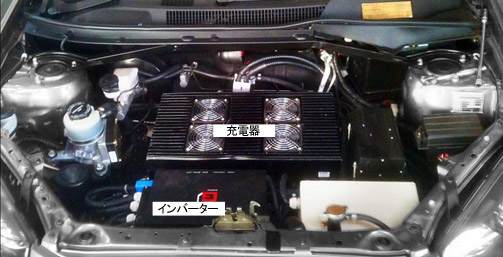 エンジンや補機類を取り外し、代わりにモーターやモーターを制御するインバーター、充電器等の部品が搭載されています。