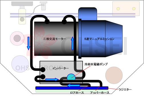 ●電磁ポンプで冷却水を循環し、駆動用モーターとイン